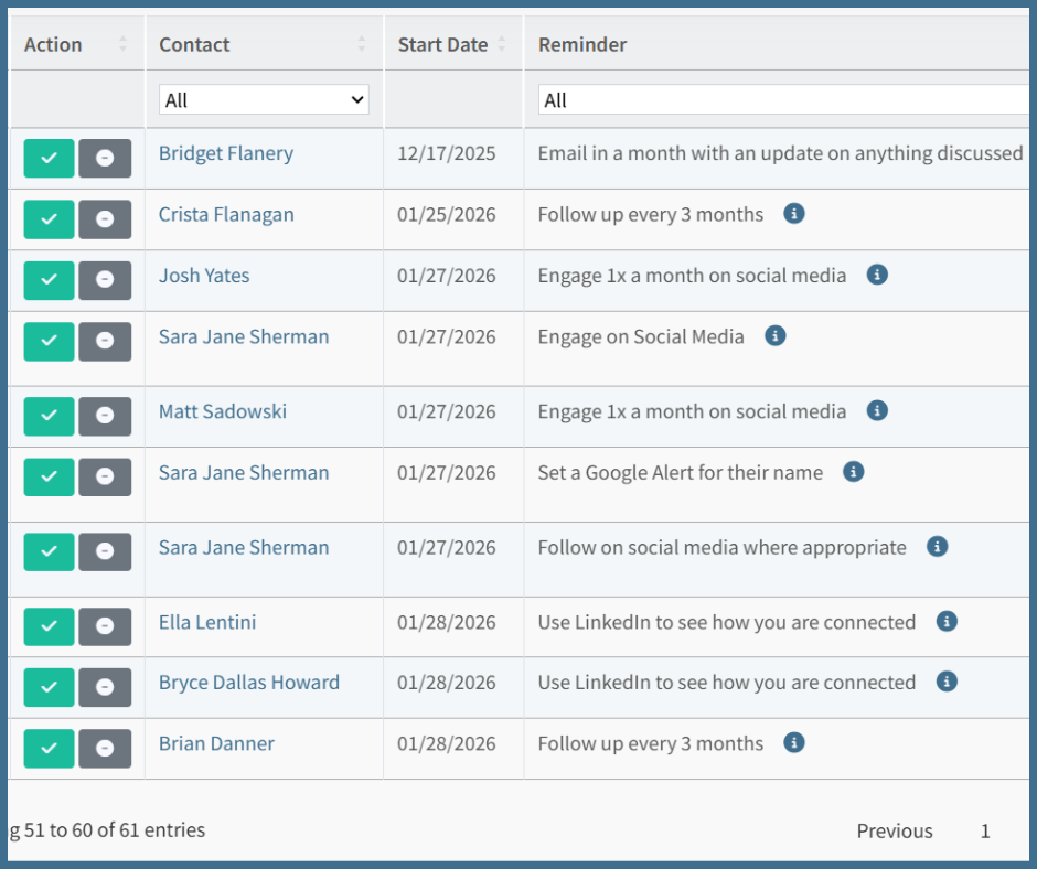 1. Your contacts are categorized into Targeted Lists or Maintenance Lists which are attached to automated systems and reminders to build that relationship or maintain that relationship.