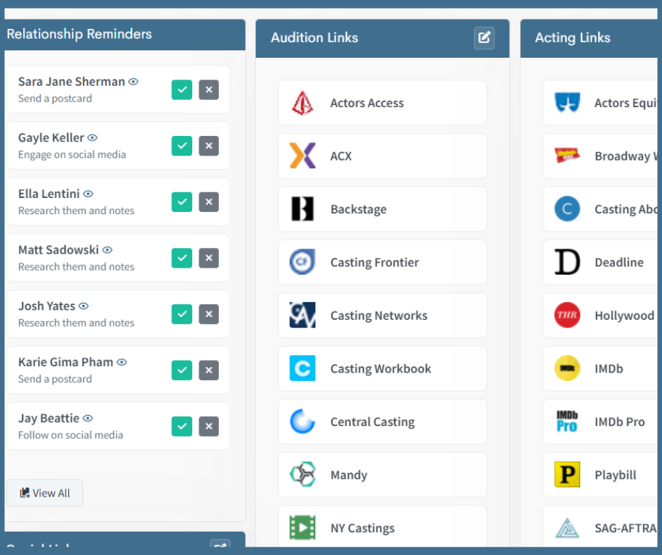 First off, so glad you’ve been keeping track of stuff! I was just like you. I had my spreadsheet that I updated constantly. Then I became frustrated by its limitations. I was forgetting to follow up with people. All my info felt buried and not accessible. It wasn’t actionable! That’s why I created The Actor’s Office.